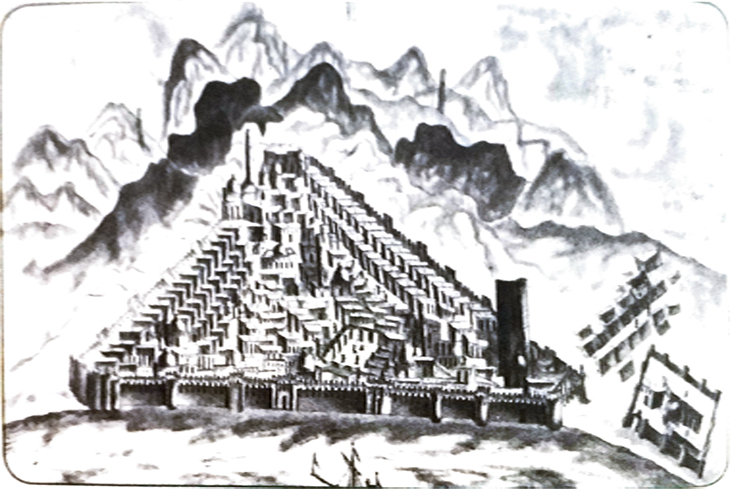 (Resimdeki Gravür: Bakü'nün kalbi Taşlı Kal'a'yı ve iç şehri göstermektedir. Hz Pir'n mescidi, türbesi ve hangahı şehrin arka canibinden görünmektedir.)